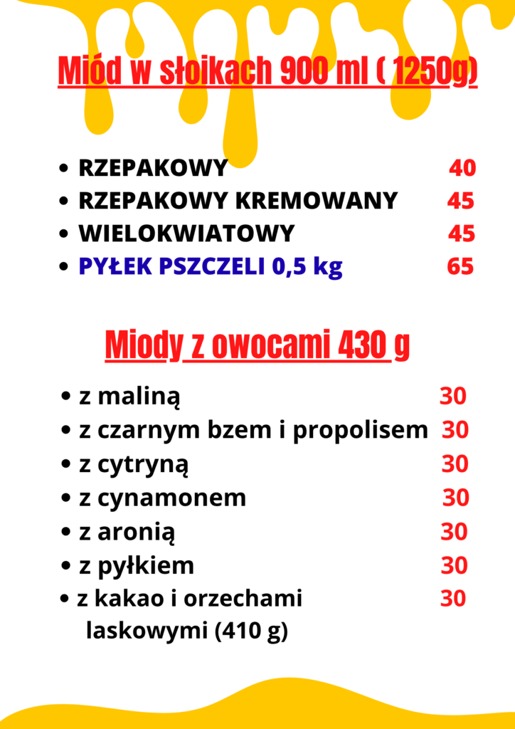 Zamówienia produktów pszczelich przyjmuję mailowo lub telefonicznie:
